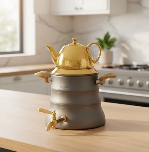 کتری قوری نزاز 6 لیتری طرح هرمی طوسی طلایی کد 3026