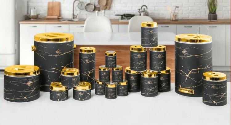 اقلام تشکیل دهنده: شش عدد ظرف حبوبات – سه عدد پاسماوری – یک عدد ظرف قند – یک عدد ظرف شکر – یک عدد ظرف پاستا (ماکارونی) – یک عدد ظرف برنج – یک عدد سطل زباله – شش عدد ظرف ادویه به همراه پایه (7پارچه)