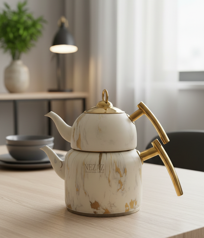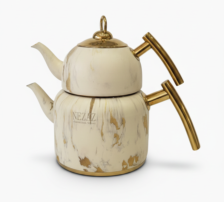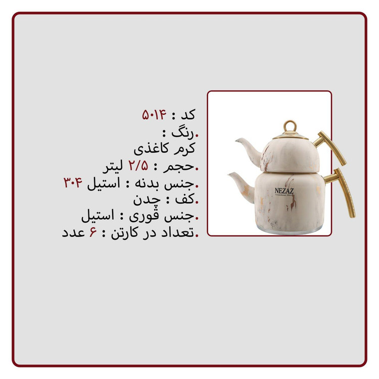 کتری و قوری 2/5 لیتری نزاز یک انتخاب عالی برای دمآوری چای خوشطعم و اصیل ایرانی است. این محصول با طراحی زیبا، ظرفیت مناسب و بدنه استیل ضدزنگ ساخته شده تا سالها در آشپزخانه شما دوام داشته باشد.